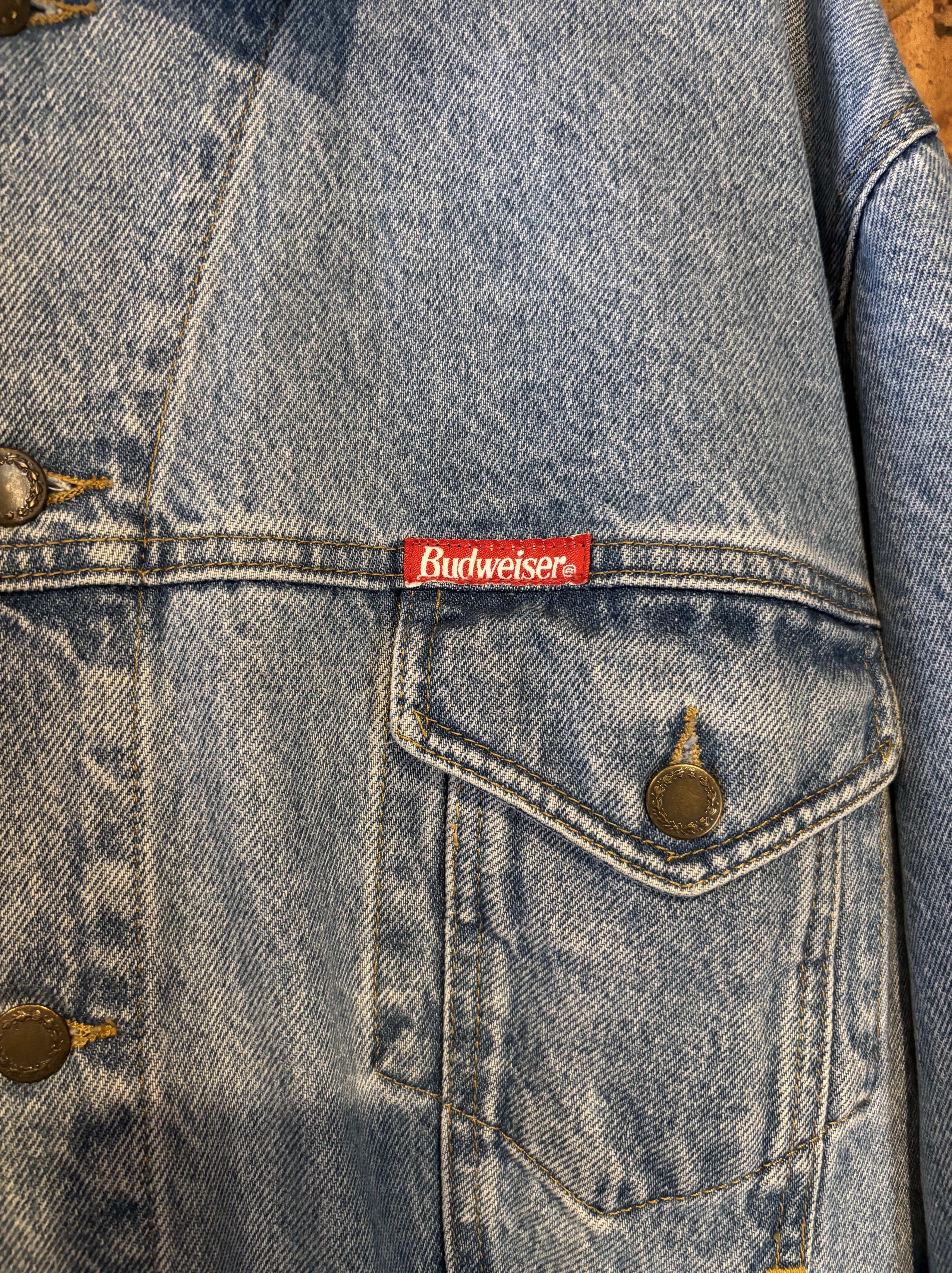 特徴:胸ポケットの上に赤い「Budweiser」のロゴ刺繍