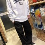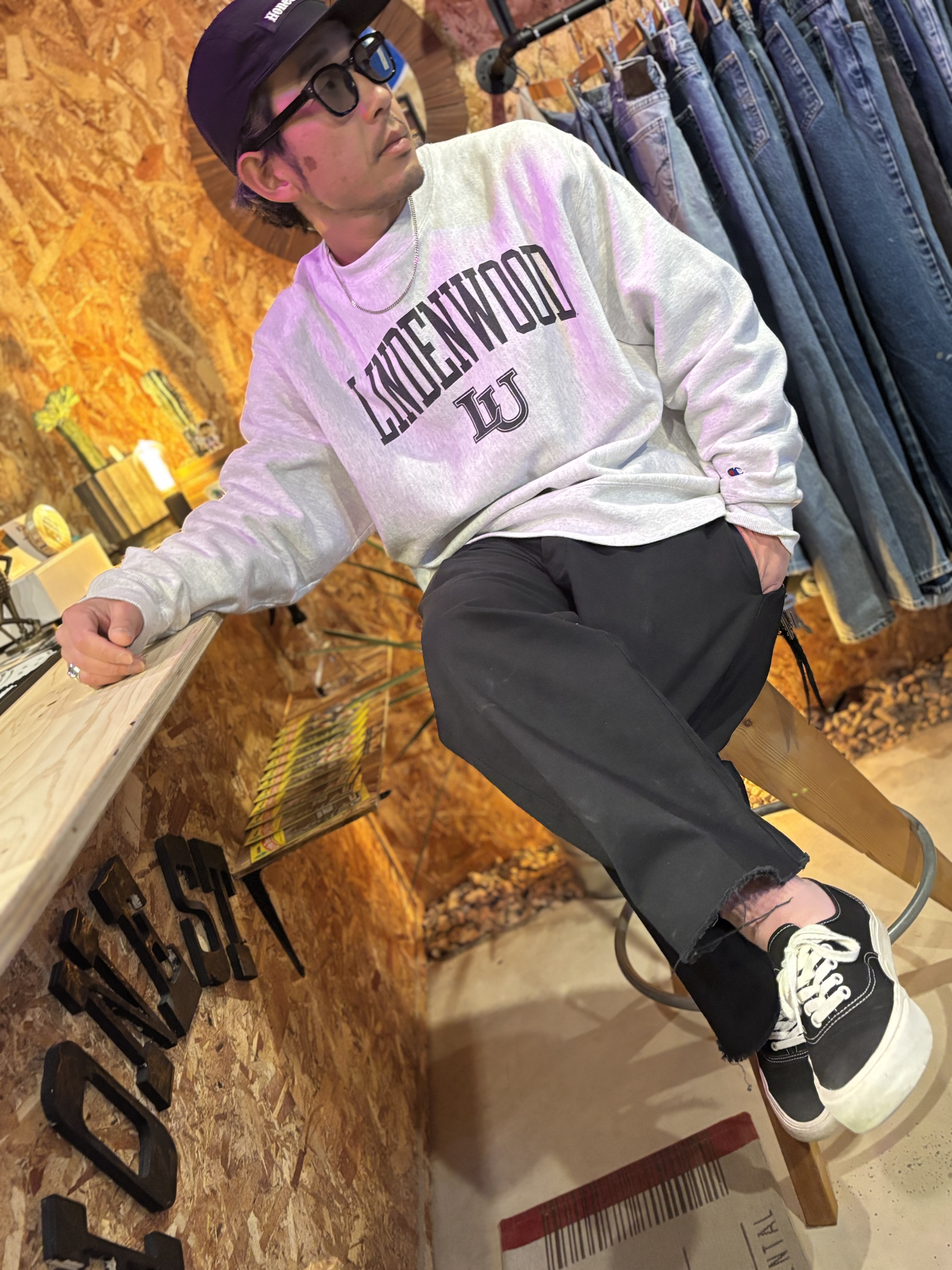 風合いのいい霜降りグレーのボディに、アーチ状の「LINDENWOOD」の文字と頭文字「L U」のロゴがプリントされた、アメカジの定番アイテムです。