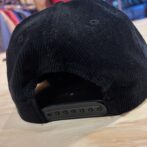しっかりとした畝(うね)のあるブラックコーデュロイ生地に、シルバーのメルセデス・ベンツR107 SLシリーズ(1971年〜1989年)の車種イラストとロゴが刺繍された、クラシックで魅力的なデザインです。